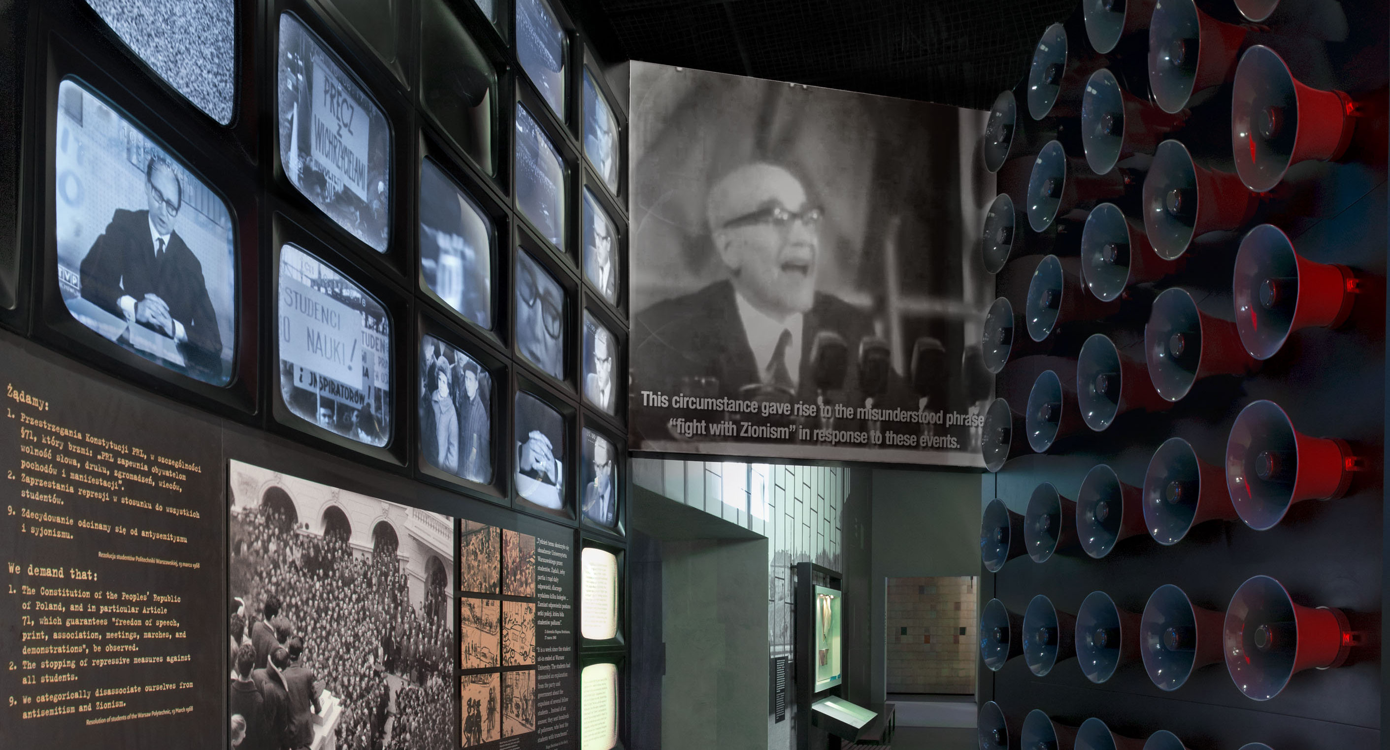 Fot. Magdalena Starowieyska, Dariusz Golik (Muzeum Historii Żydów Polskich) – Wystawa główna Muzeum Historii Żydów Polskich w Warszawie. Galeria „Powojnie”, Fragment ekspozycji poświęconej wydarzeniom marcowym (CC BY-SA 3.0 pl).